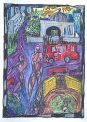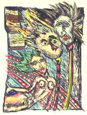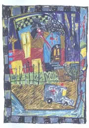 The figures in the prints are of a defenseless child or a tortured and twisted adult existing in an alien and often violent setting. The figures are drawn in a childlike fashion or appear disjointed and twisted in their brightly colored environment. It is the unreal and exaggerated world of the circus or cartoons. It is the outside appearance masking a darker nature. It is the softness of a defenceless child and an adult twisted into deformity.